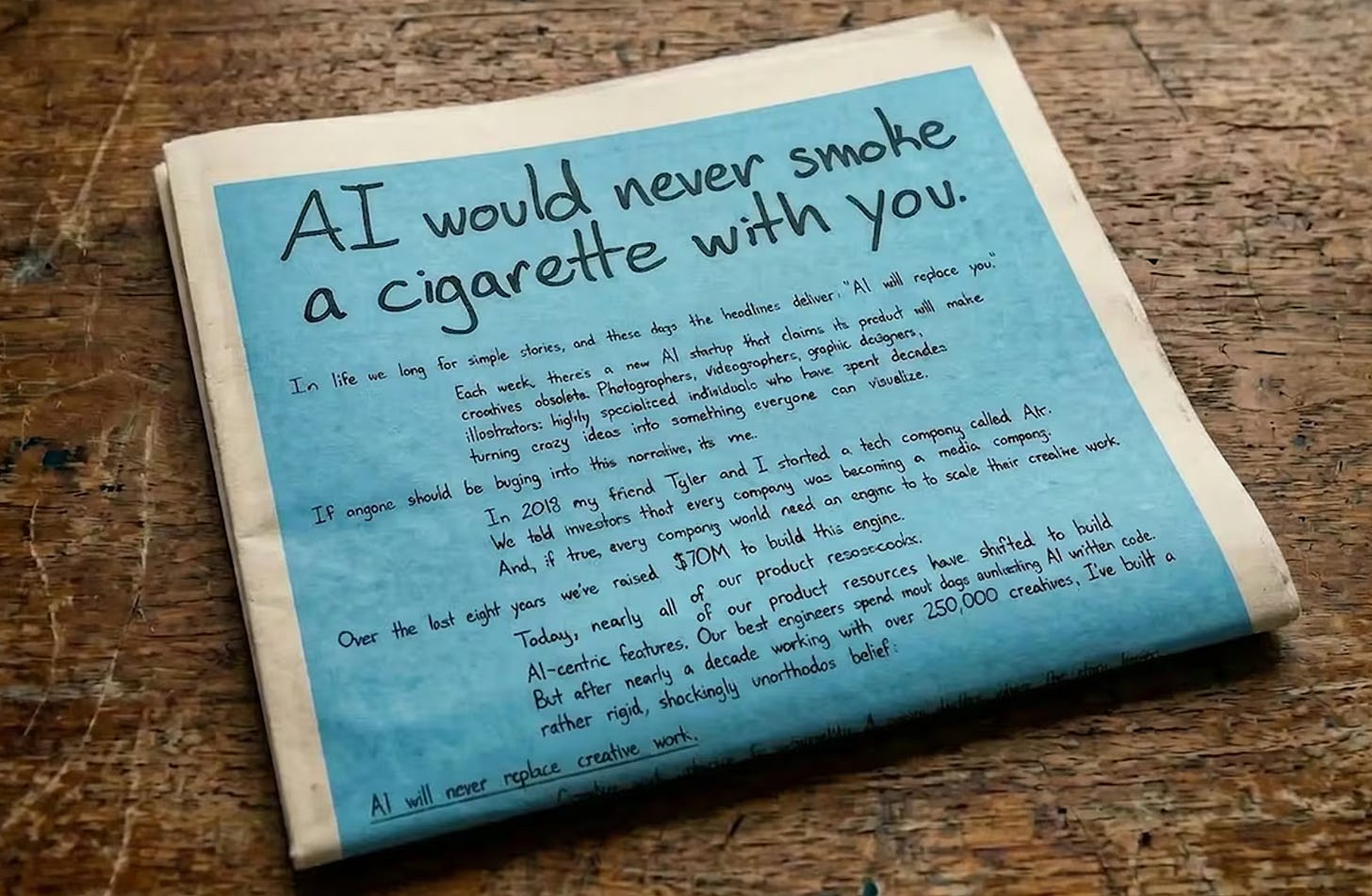 Adweek本周的报道指出,2025年品牌对AI的态度还停留在谨慎,2026年已经升级为公开表态。越来越多品牌在广告中批评AI生成的低质内容(”AI slop”),把”真实性”和”非AI”作为品牌定位的核心卖点。Dove在2024年率先反对AI造假内容,BMW在2025年延续了这一趋势。Aerie(美国内衣品牌American Eagle旗下)的CMO Stacey McCormick把事情推到了新高度:品牌公开承诺永不在营销中使用AI生成的人体形象,并请Pamela Anderson(90年代全球最具辨识度的性感符号(出演《海滩救护队》),近年转型为素颜、反修图的”真实美”倡导者)主演广告——广告里面 Anderson向AI Agent输入提示词试图生成”真实感”女性形象,结果荒诞可笑,最终回归使用真实模特。创意运营平台Air的做法更具戏剧性——在发布新AI工具的同一天,CEO Shane Hegde在《纽约时报》买了整版手写广告,标题是”AI would never smoke a cigarette with you”(AI永远不会陪你抽一根烟),论证零到一的原创创意依赖怀疑、犹豫和人的判断。一家AI工具公司用反AI叙事做品牌区隔——当AI工具公司都认为”反AI”有传播价值时,消费者端的情绪已经强烈到可以被商业化利用了。
